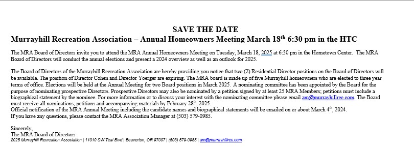 Annual Meeting March 2025 Documents Posted on: 02.18.25 | by MRA AdminPlease find the documents for the 2025 Annual Meeting below Notice of Meeting Candidate Biographies Proxy Agenda Presentation